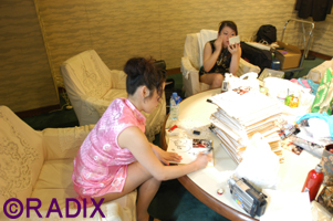 | 控え室で色紙にサイン書く友崎さん。今回はお客さん以外にも全国の委託店さんの為500枚用意させて頂きました!って玲子ちゃんもう疲れてるし・・・ |