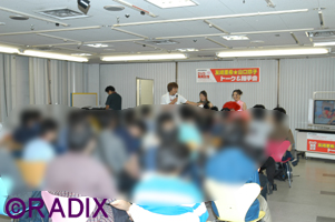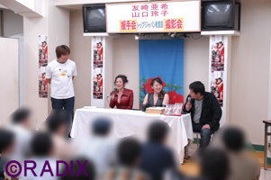 | 集まってくれたお客さんは約30人!質問タイムでは「何故人気が出たんですか?」とのお客さんの質問に友崎さんが「おっぱい大きいから!」と答え、場内大爆笑! |